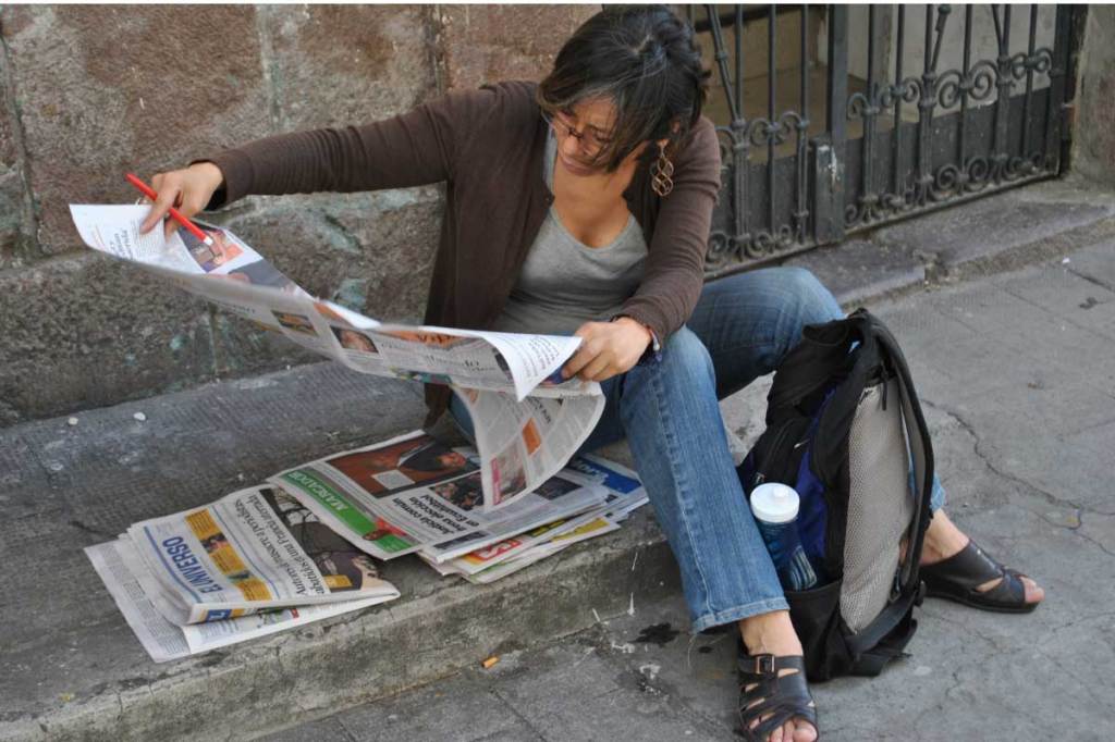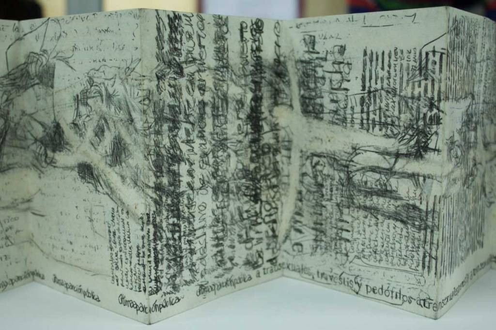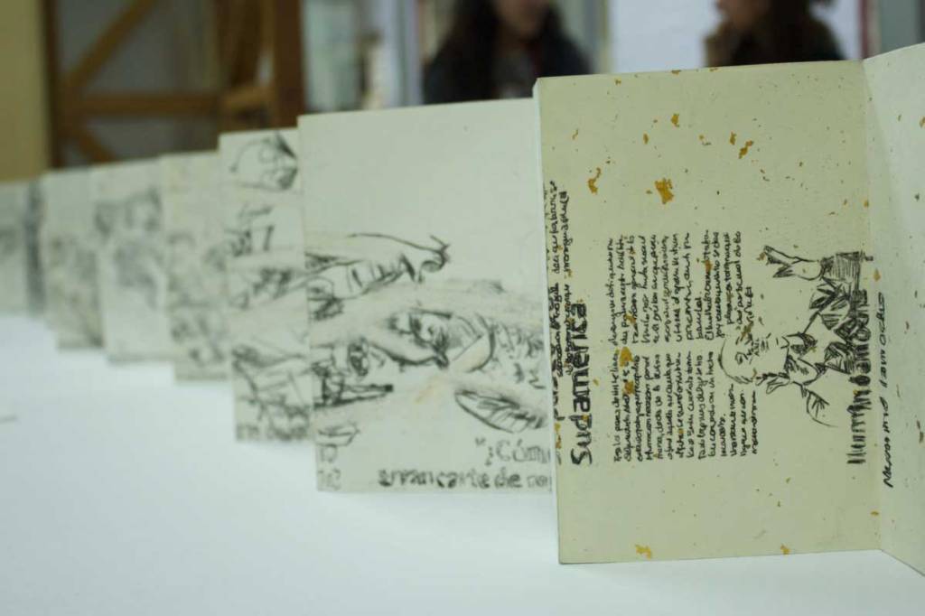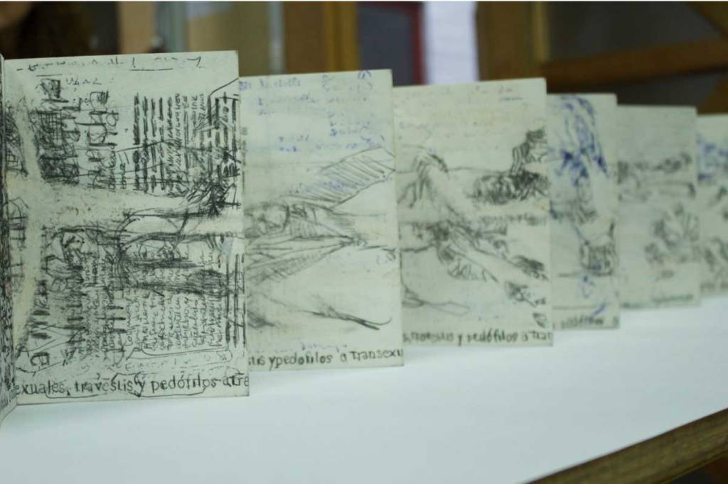 Mi acción incorpora un ejercicio simultáneo de registro de las acciones que los artistas realizaron en la ciudad. El registro que realicé de los performances de los artistas consistió en tachar, subrayar, reescribir palabras o imágenes en las hojas de todos los periódicos publicados ese día. La actividad de registro se desarrolló en los momentos en que suspendía la lectura de la prensa de aquel día, los períodicos se usaron para realizar dibujos a manera de registros de las acciones de los otros artistas, luego se guardaron, cosieron y se los uso para acciones posteriores en el 2017-18.