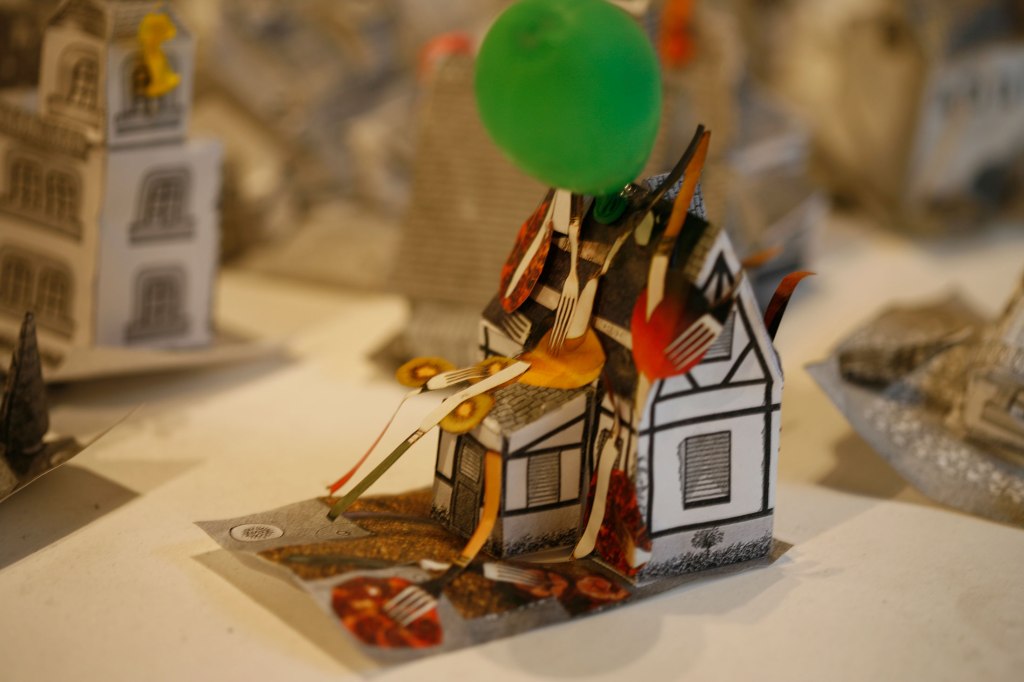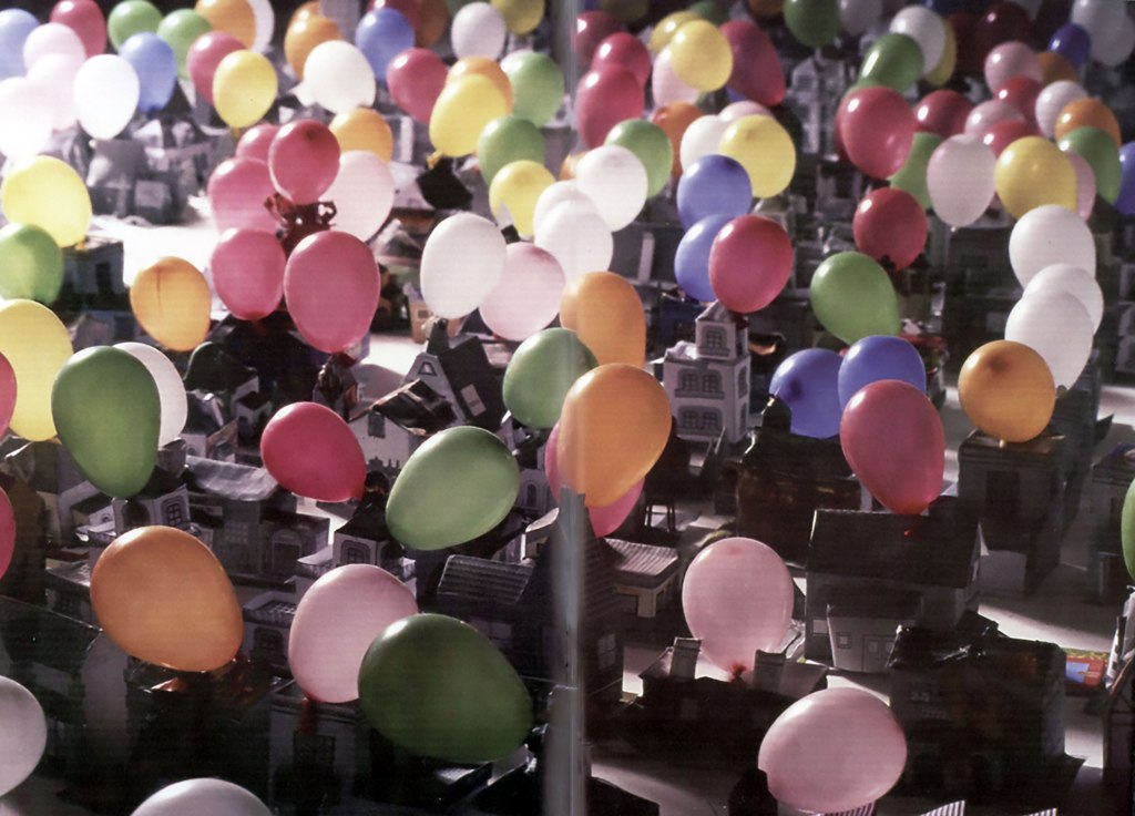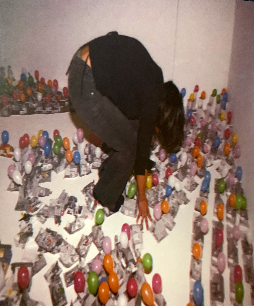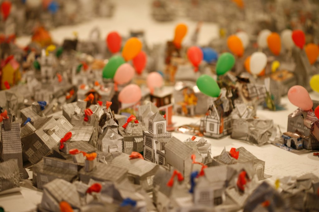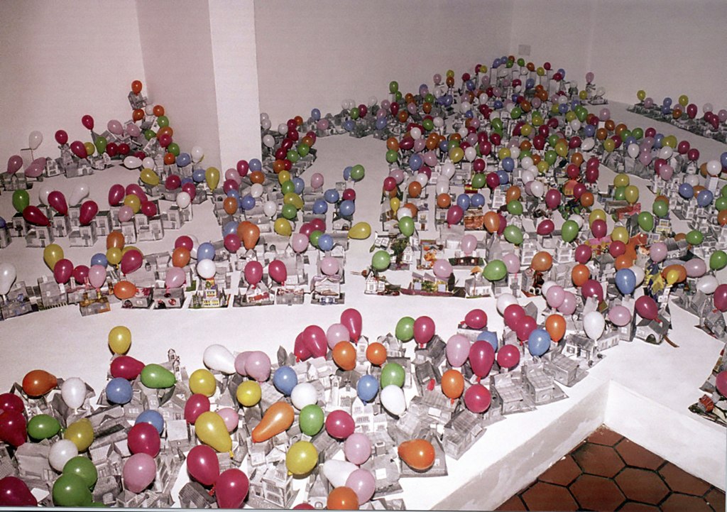 Instalación, performance, papel, globos, madera