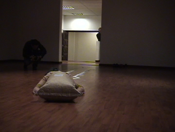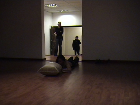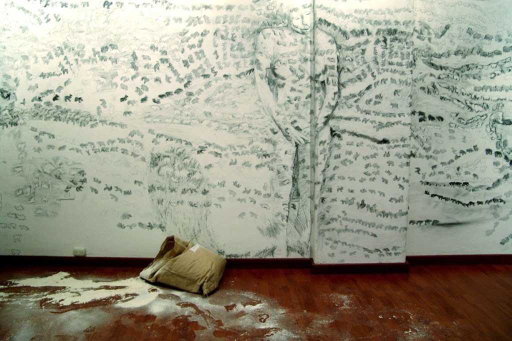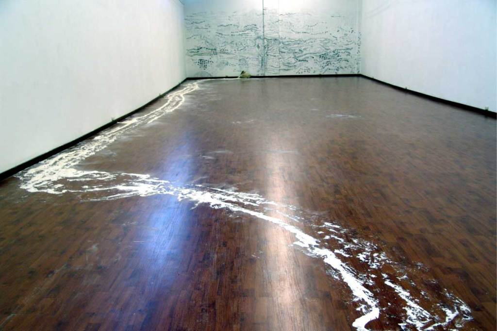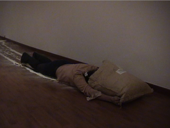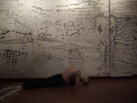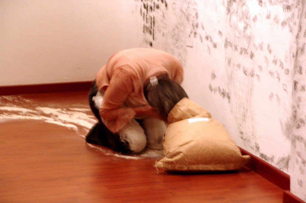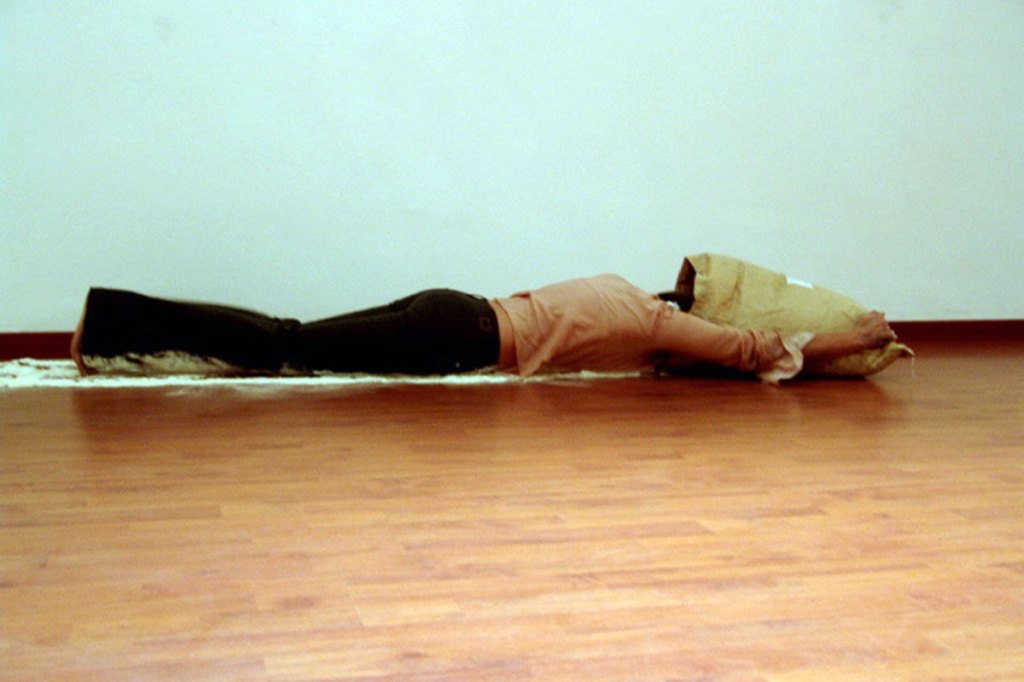La artista sumerge su cabeza en un saco de harina y lo empujó a lo largo de la galería, durante más de veinte metros. Del otro lado de la sala está dibujado sobre la pared, a escala real, se encuentra una escena de su performance-instalación Piel-Pared-Galleta presentado en 1995.